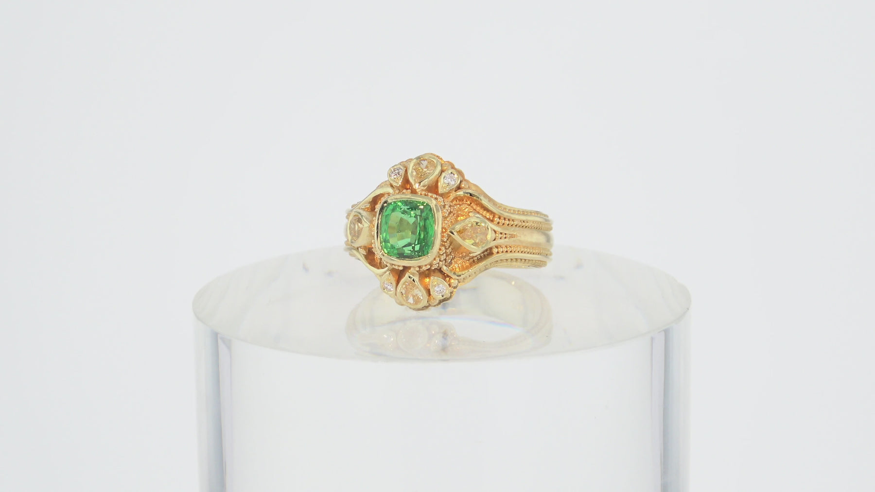 A new bespoke ring from the Kent Raible Masterworks collection has arrived! The Chrome Tourmaline is one of the most lively we've seen, and so close to the color of Emerald. Kent has surrounded the ring with lovely pear shaped Yellow Sapphires for a subtle sparkle, and small white diamonds to add the brilliant sparkle. This ring has all the intricate detailing and fine craftsmanship we come to expect from this artists. It's easy to see why his work is collected by museums!
