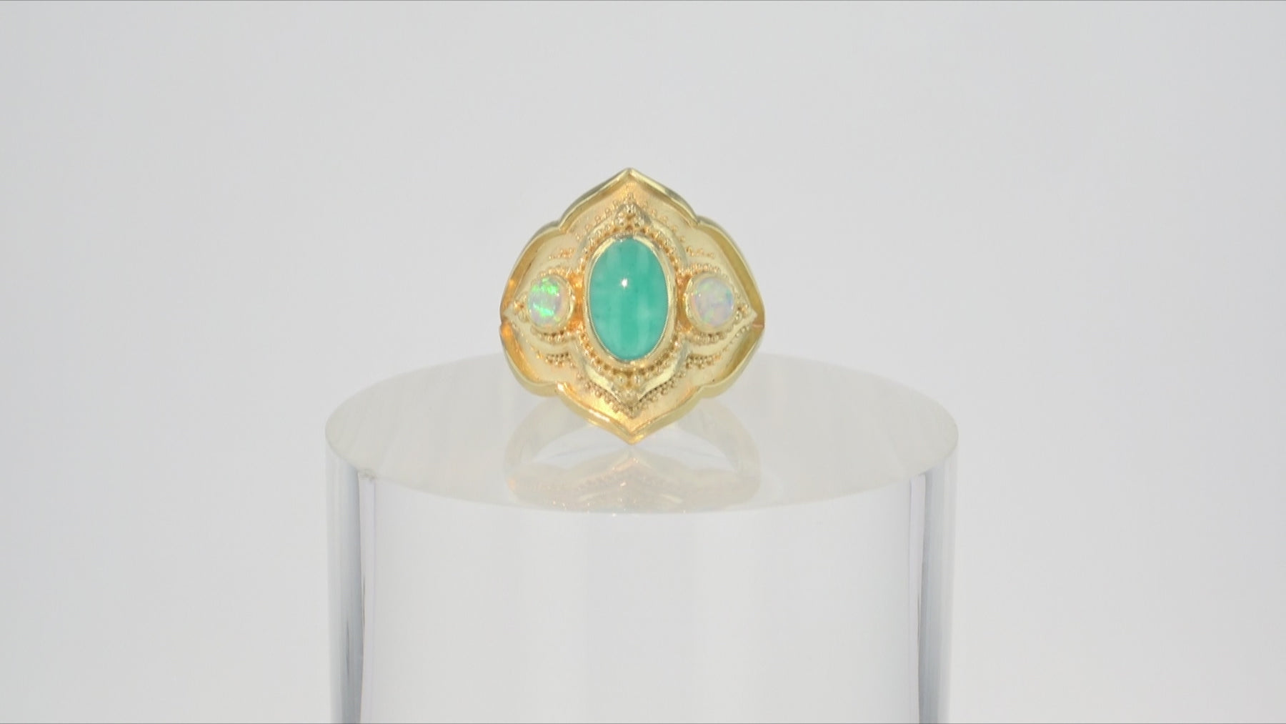 Kent Raible's one of a kind hand made Chrysocolla and Australian Opal Ring is stunning! The fine gems glow with cool summer colors and are framed in Raible's signature granulation. Chrysocolla is associated with honest communication, emotional balance, wisdom, and truth.