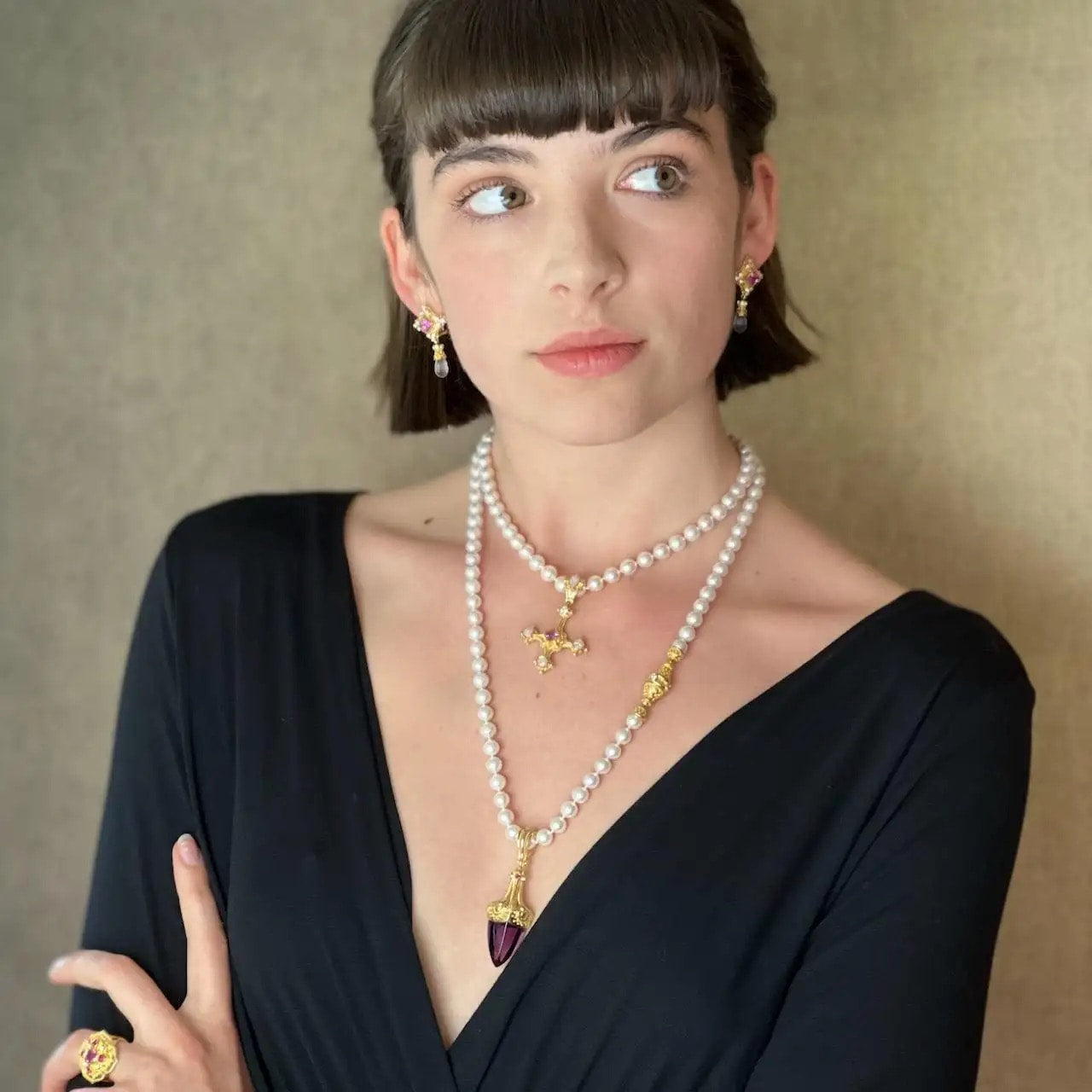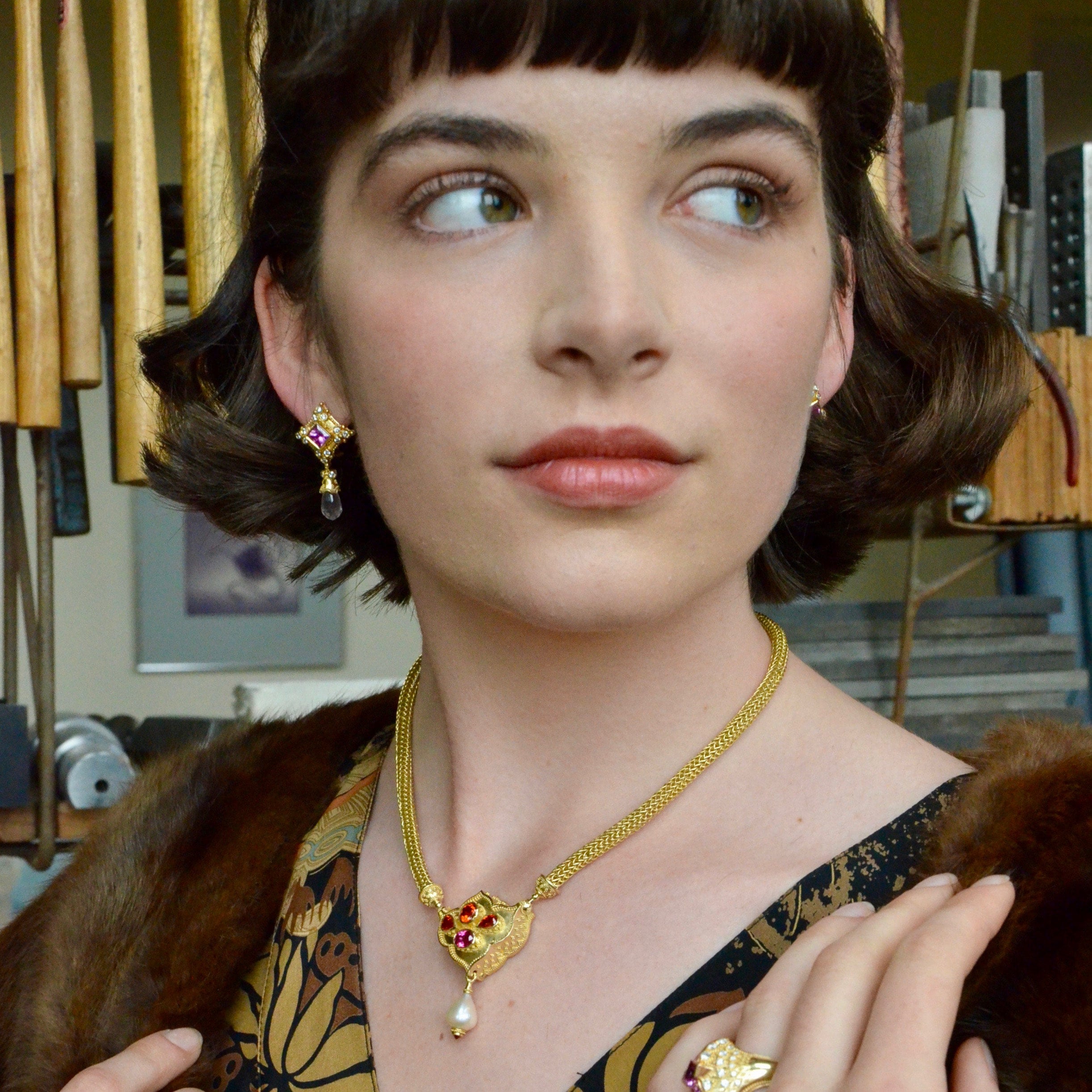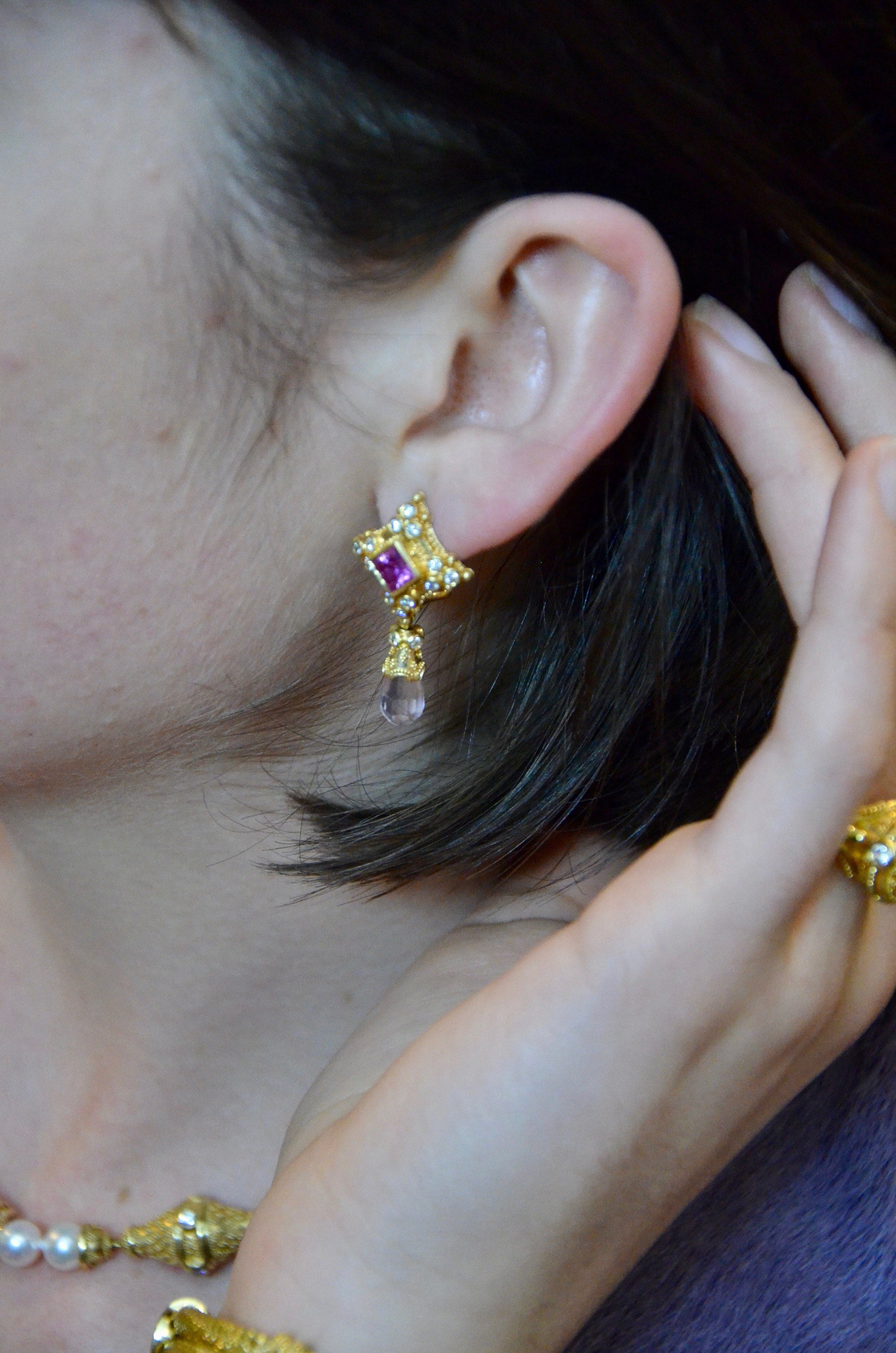 Kent Raible's elegant architecture and color style show up quite well in this stunning pair of earrings. Brilliant flashes of pink sapphire are offset with the soft glow of the rose quartz briolettes and the sparkle of diamond. The bottom half is set with a swivel to bring in playful movement, picking up the light as you move!