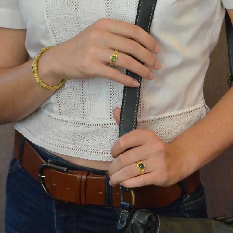Kent Raible's hand made, one of a kind Seafoam Tourmaline ring is stunning! The central gem is framed with a double row of 18K gold granulation with diamond accents creating a perfect balance between the detailed gold work and the gems.